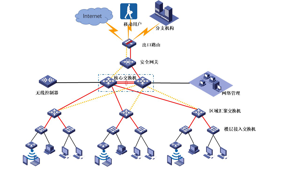 核心到汇聚到接入的分层结构具有灵活、扩展性强的优势。
